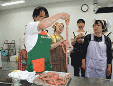 | 2.羊の腸をはめて、できるだけ均一になるように肉を詰め込んでいきます。 |