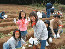 ▲「上手に抜けたかな?」さつまいも畑にて